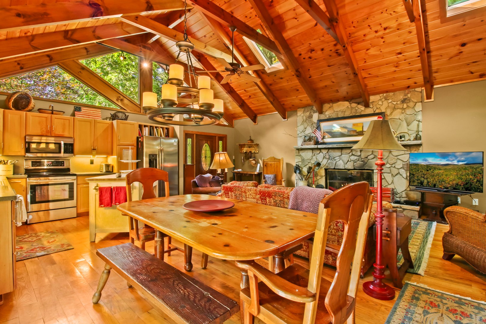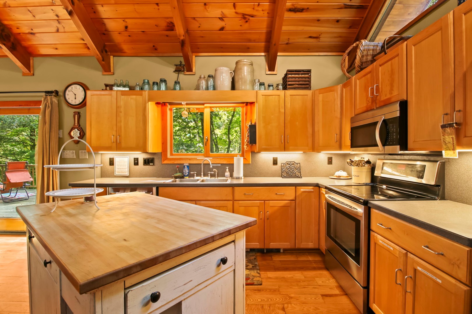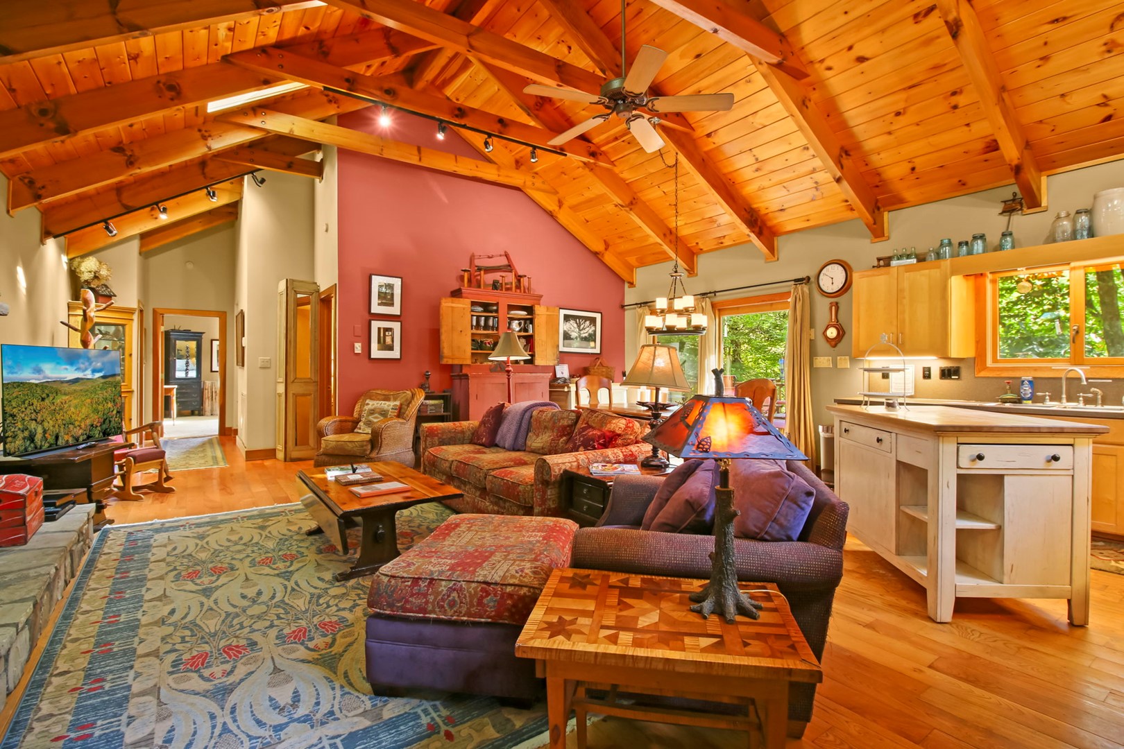 It is here that we have lovingly filled our getaway with our family heirlooms, artwork and a distinct, timeless feel of times-gone-by. White pine cathedral ceilings and wide planked ash floors provide the framework for all of this, warmly folded under quilts and the quality amenities you don’t want to do without.