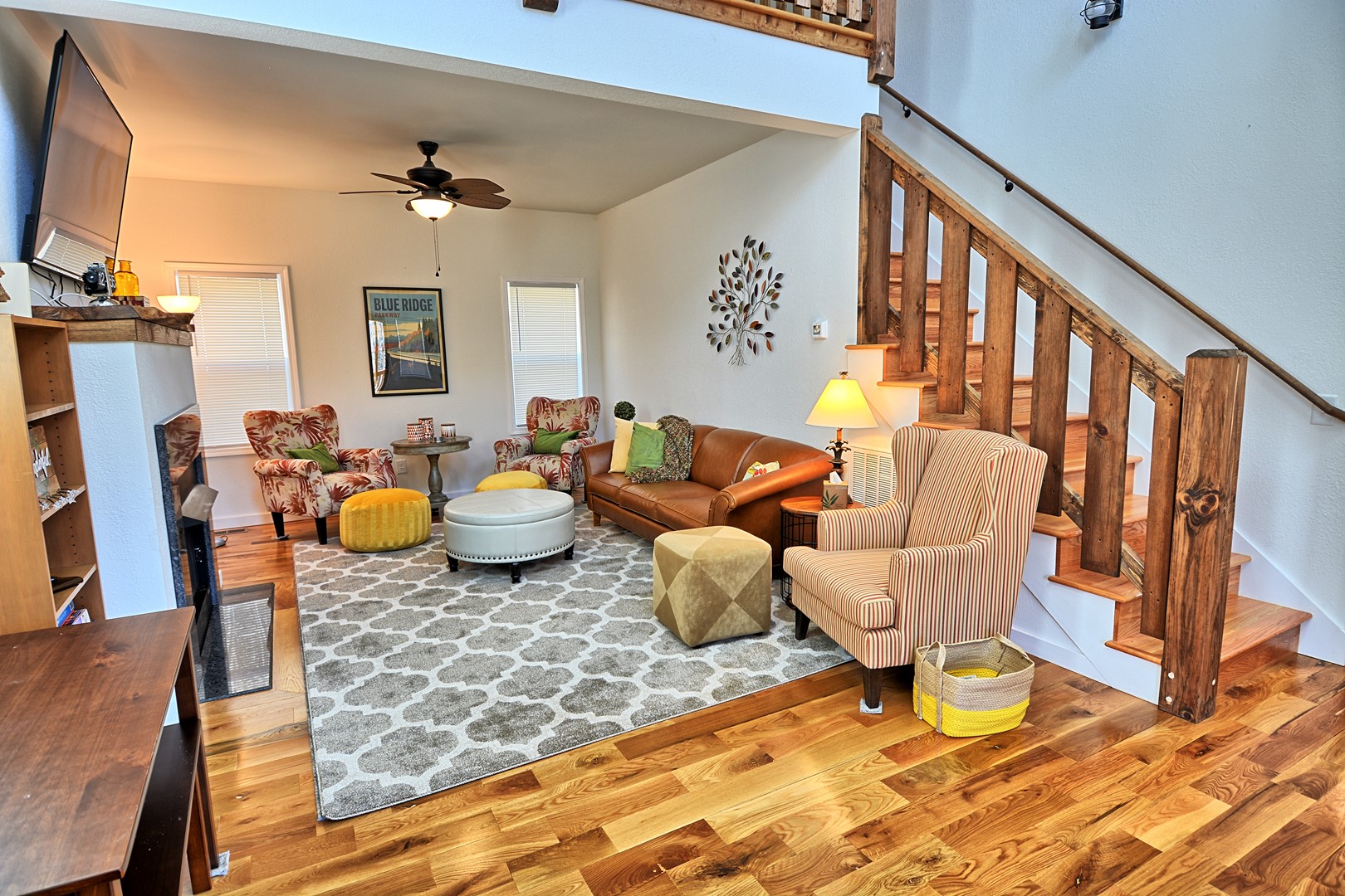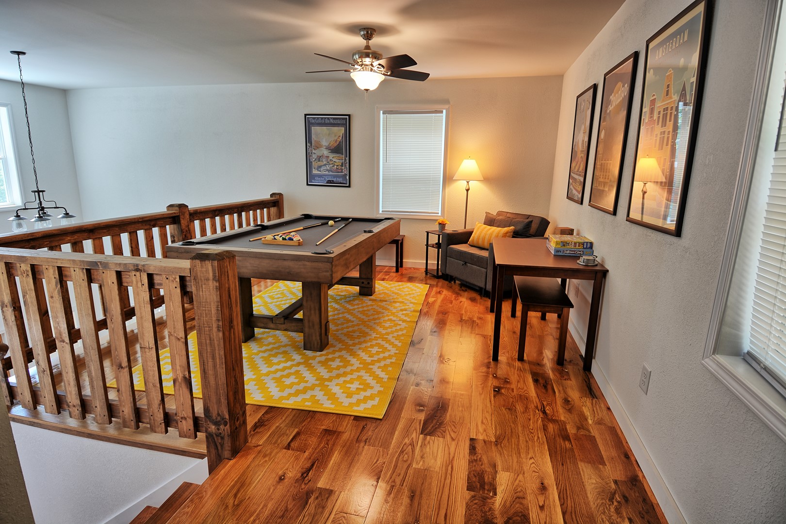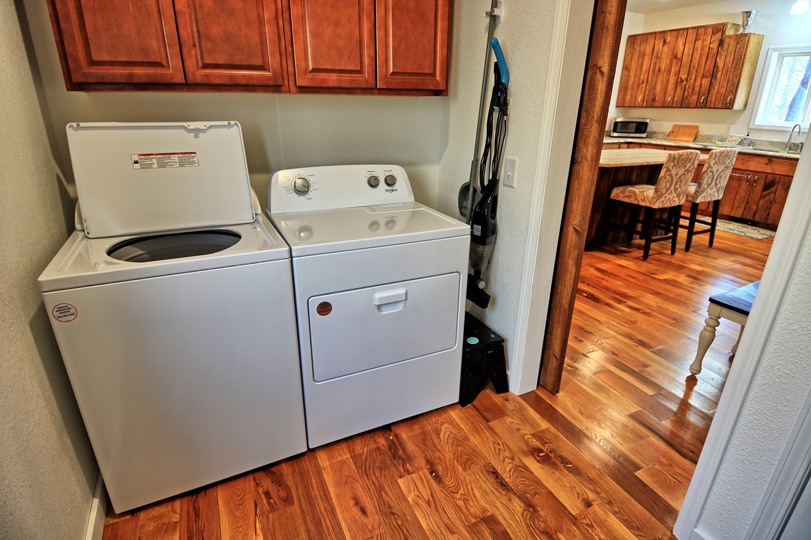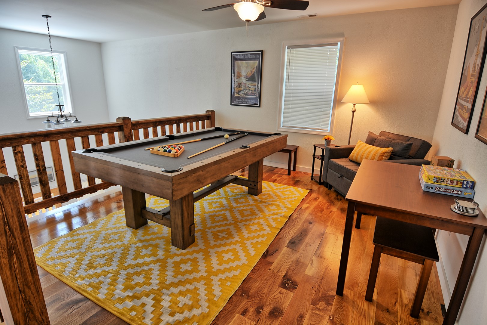INDOOR LIVING: Cozy area with flat-screen Smart TV (apps only). The laundry room with a full size washer and dryer is also on the main level. If you need to work while on vacation, there is an large office with a desk and chair on the uppler level. You can connect hardwire to the wireless router with your Ethernet cable if necessary. Enjoy a game of pool on our new pool table located in the loft.