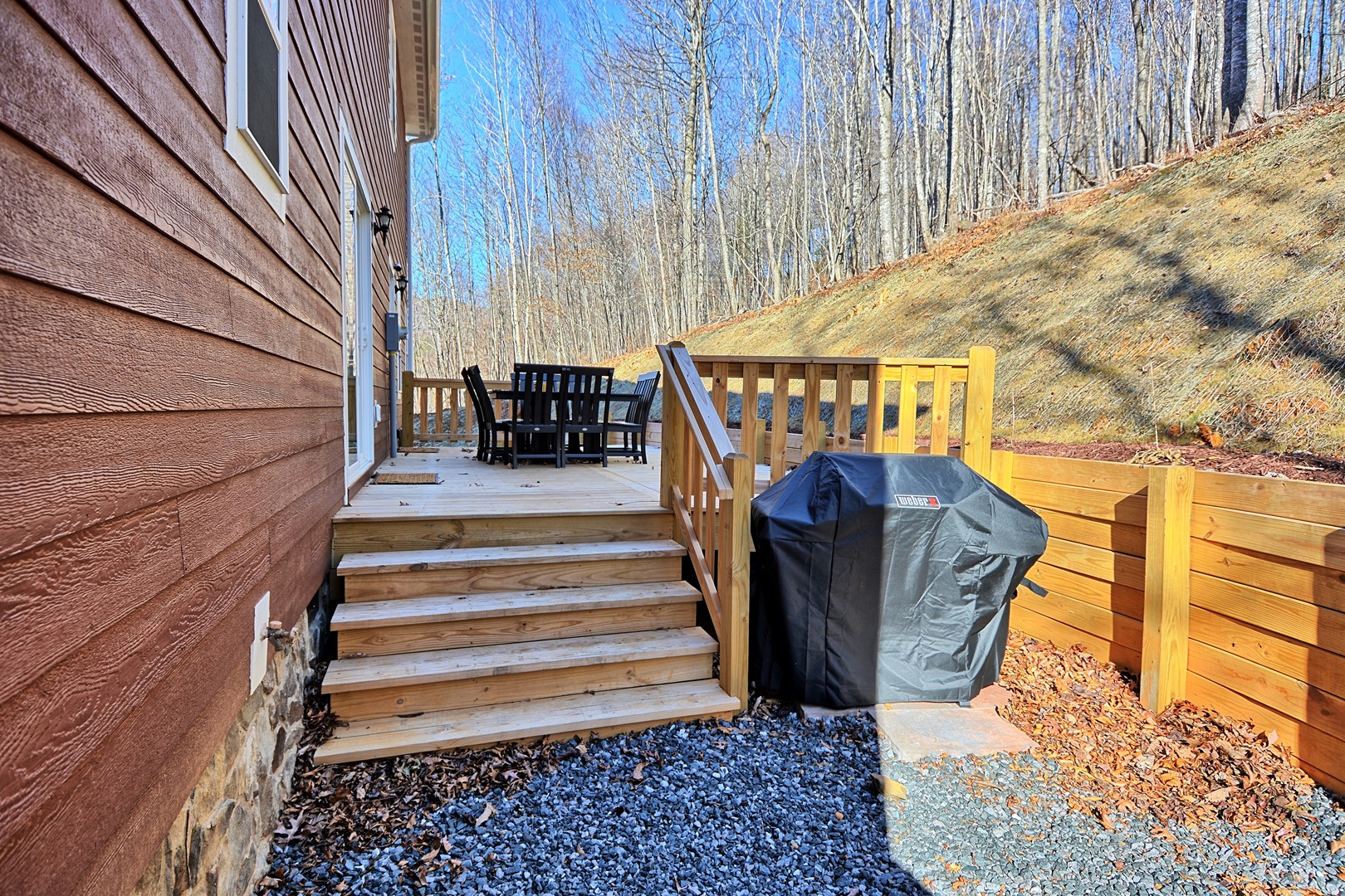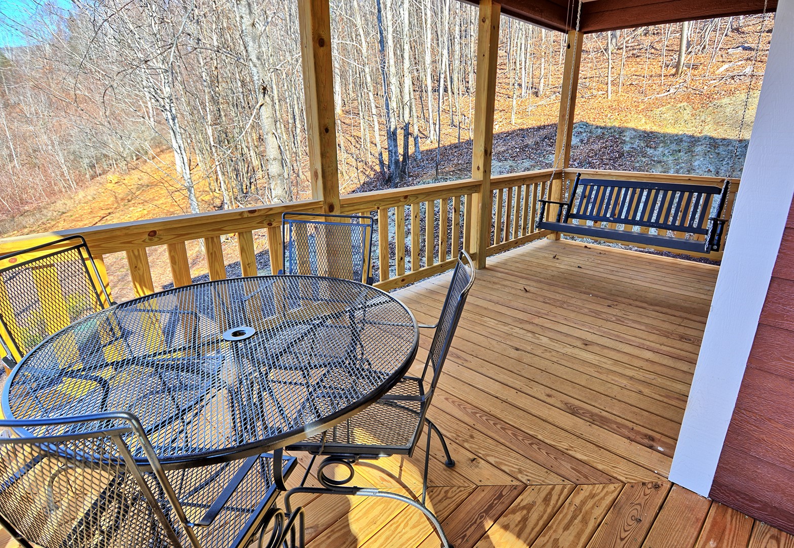 OUTDOOR LIVING: Covered deck w/ seating, gas grill, porch swing, Open back deck with seating.