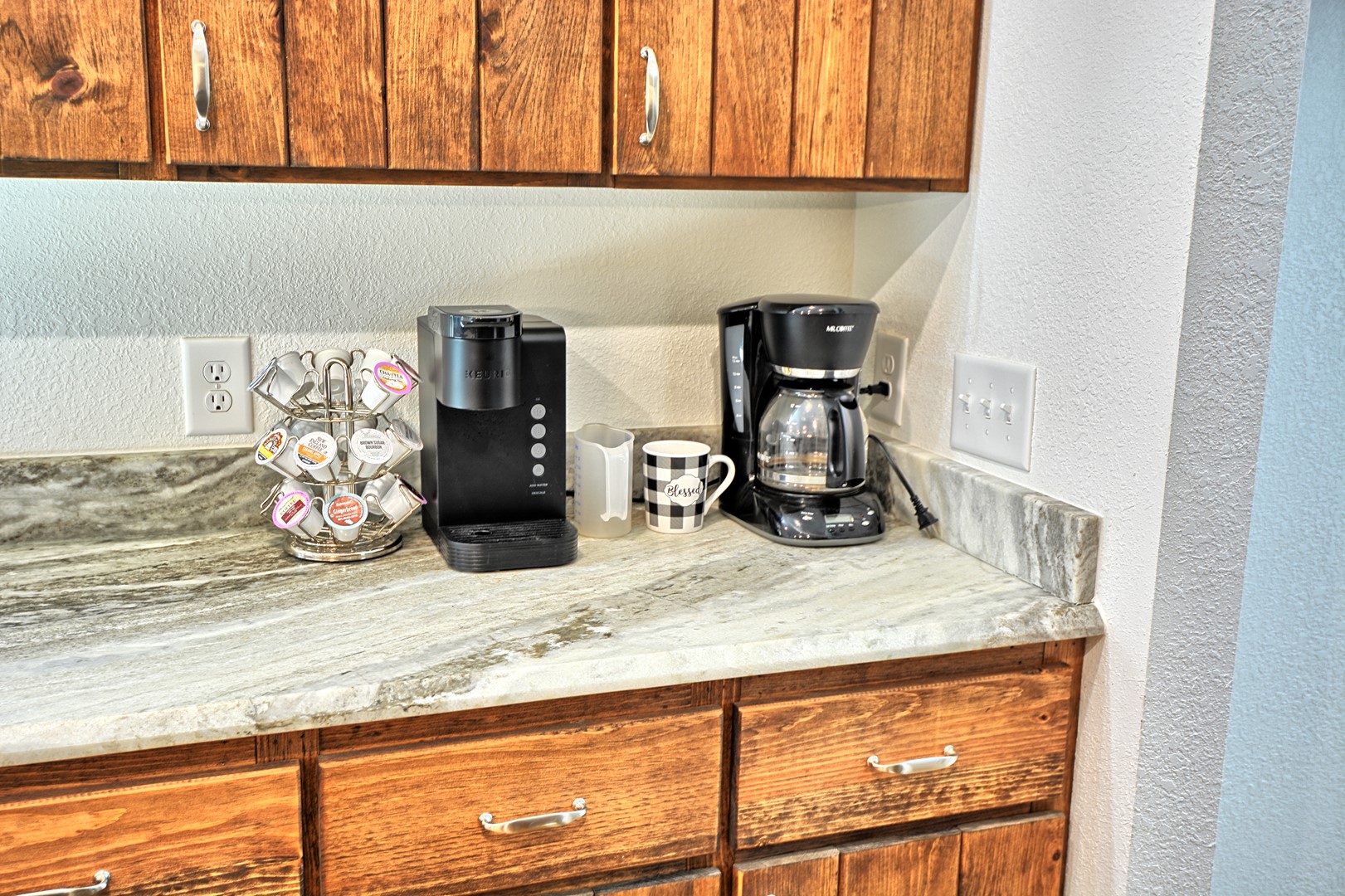 KITCHEN: Fully equipped spacious kitchen with granite counters, stainless steel appliances, microwave, dishwasher, regular coffeemaker, Keurig maker, cooking basics like pots/pans, dinnerware, silverware, slow cooker, hand mixer, food processor, and etc. The dining table can seat up to 8 guests.